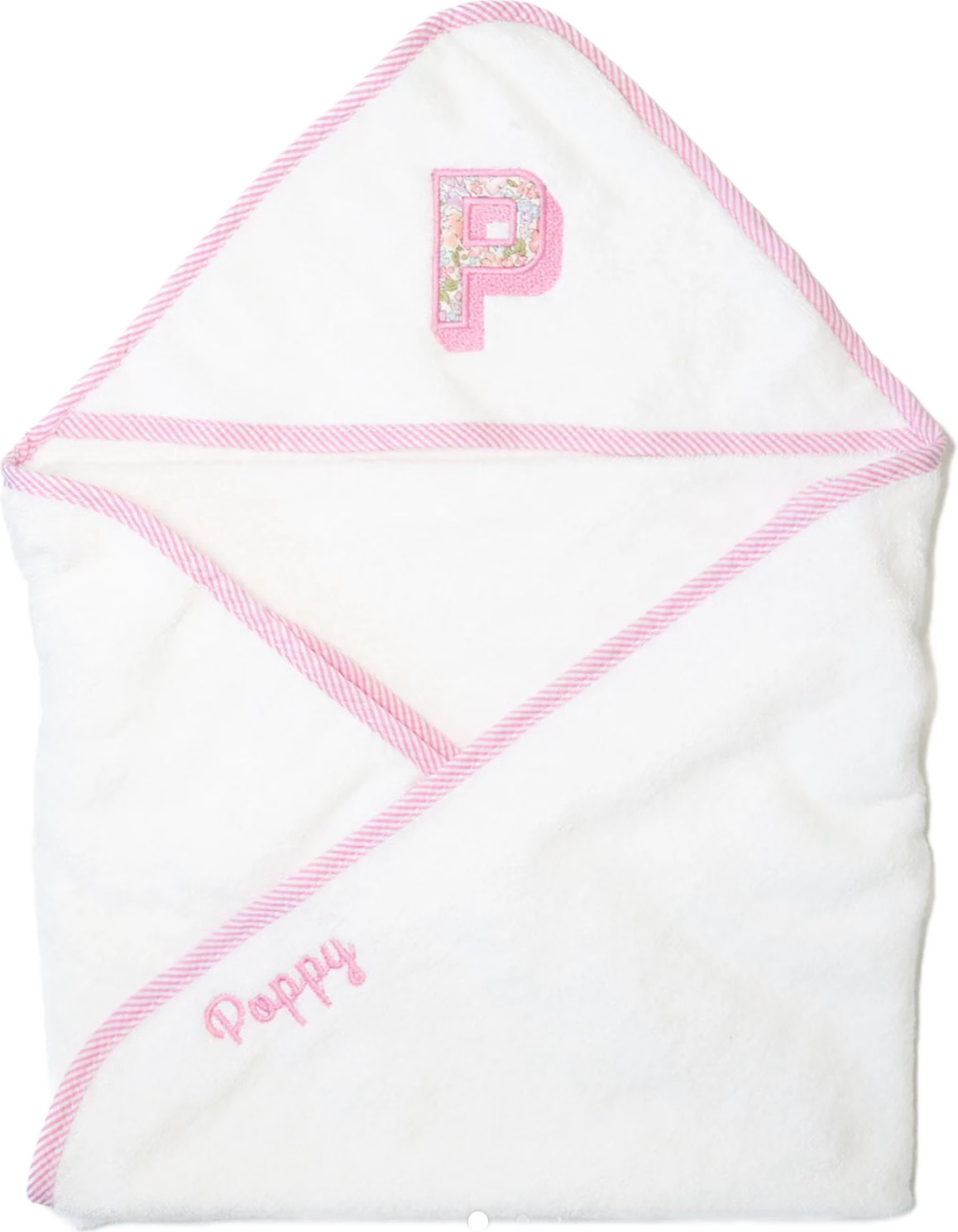 This cozy hooded towel is crafted from plush, absorbent fabric and finished with a delicate floral appliqué and custom embroidery detail. Perfect for bath time and makes the ultimate gift for a new baby.