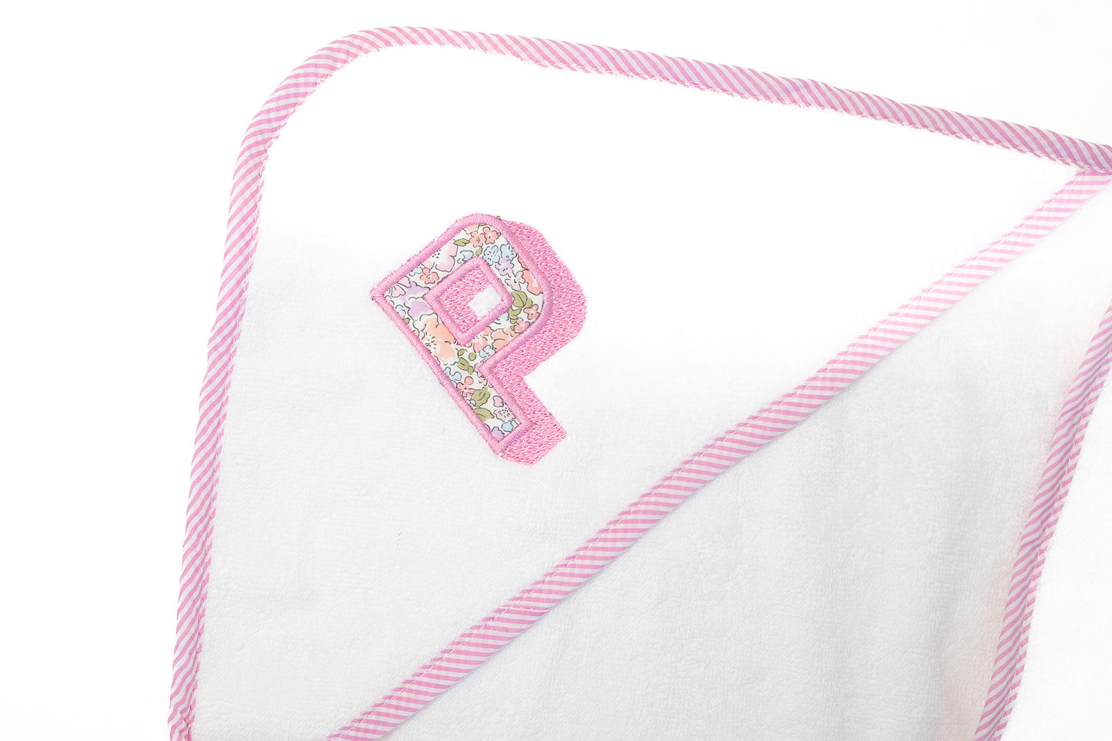 - White hooded baby towel with contrasting pink gingham trim